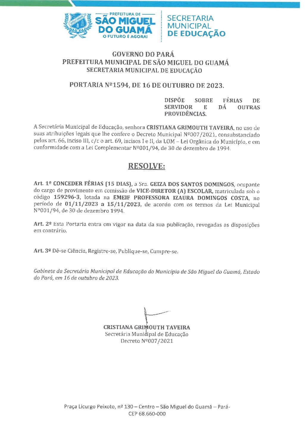PORTARIA SEMED Nº 1594 – GEIZA DOS SANTOS DOMINGOS